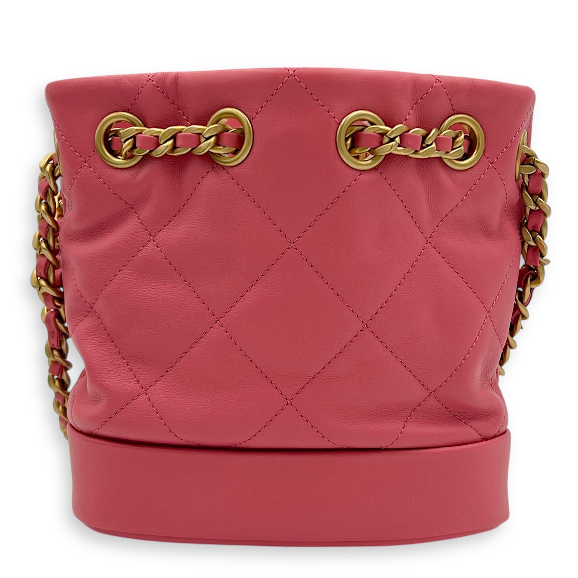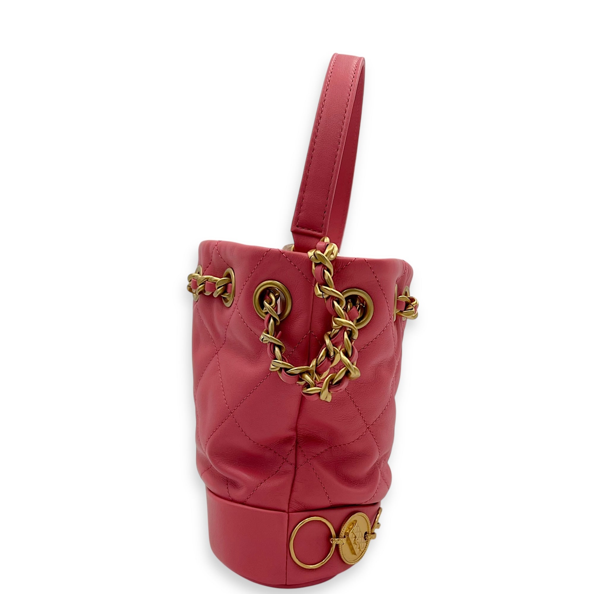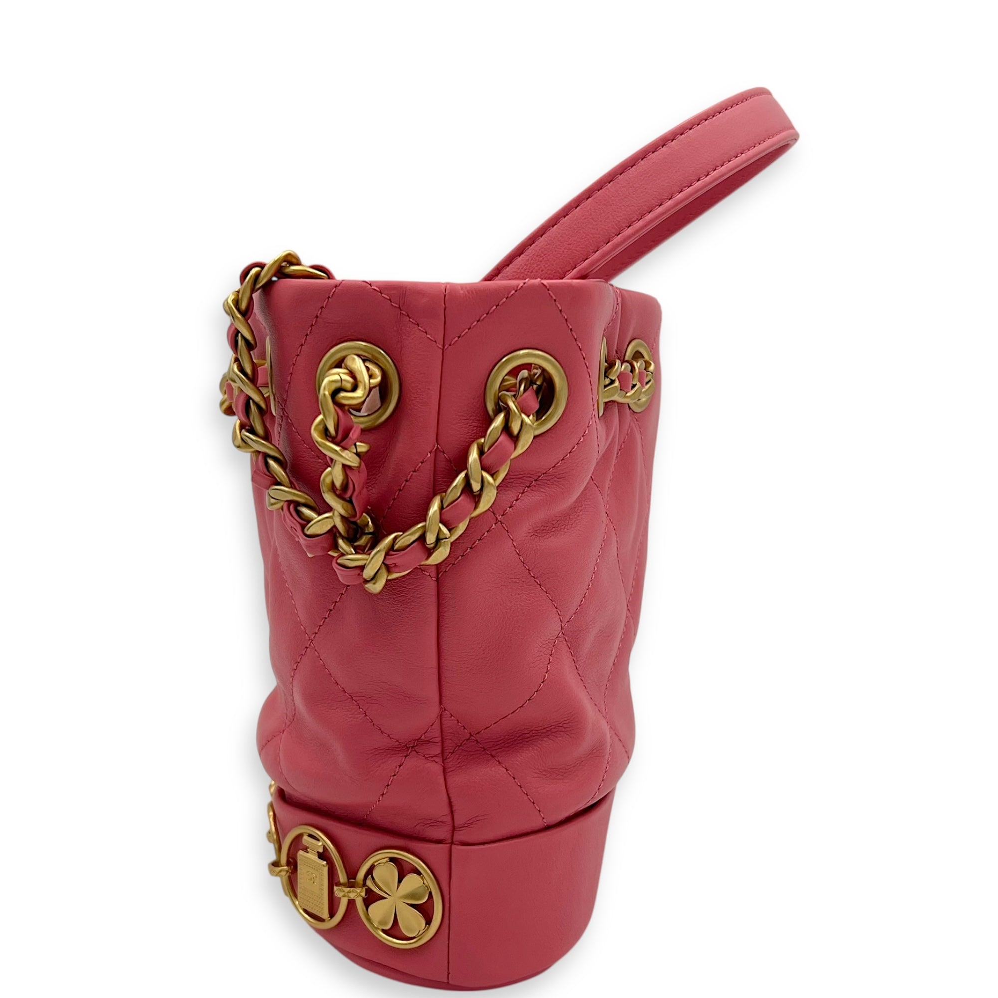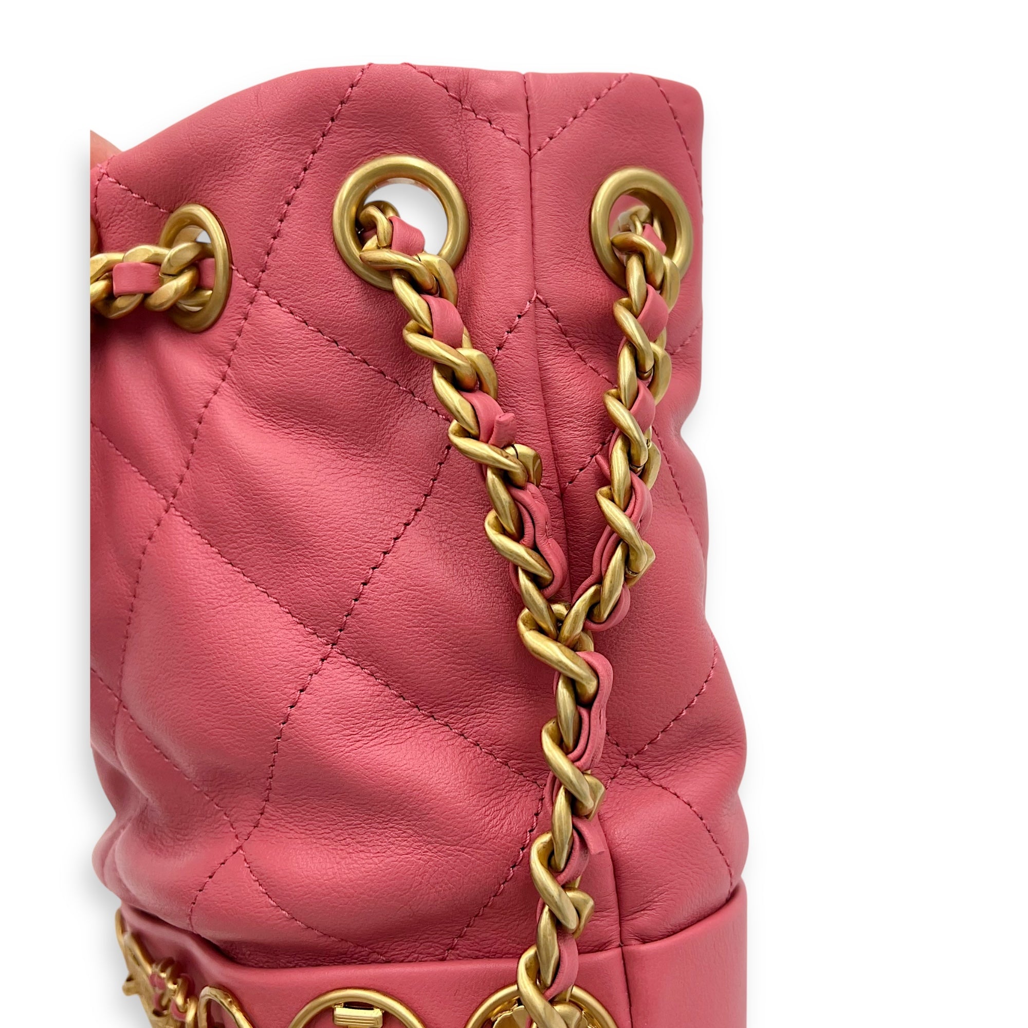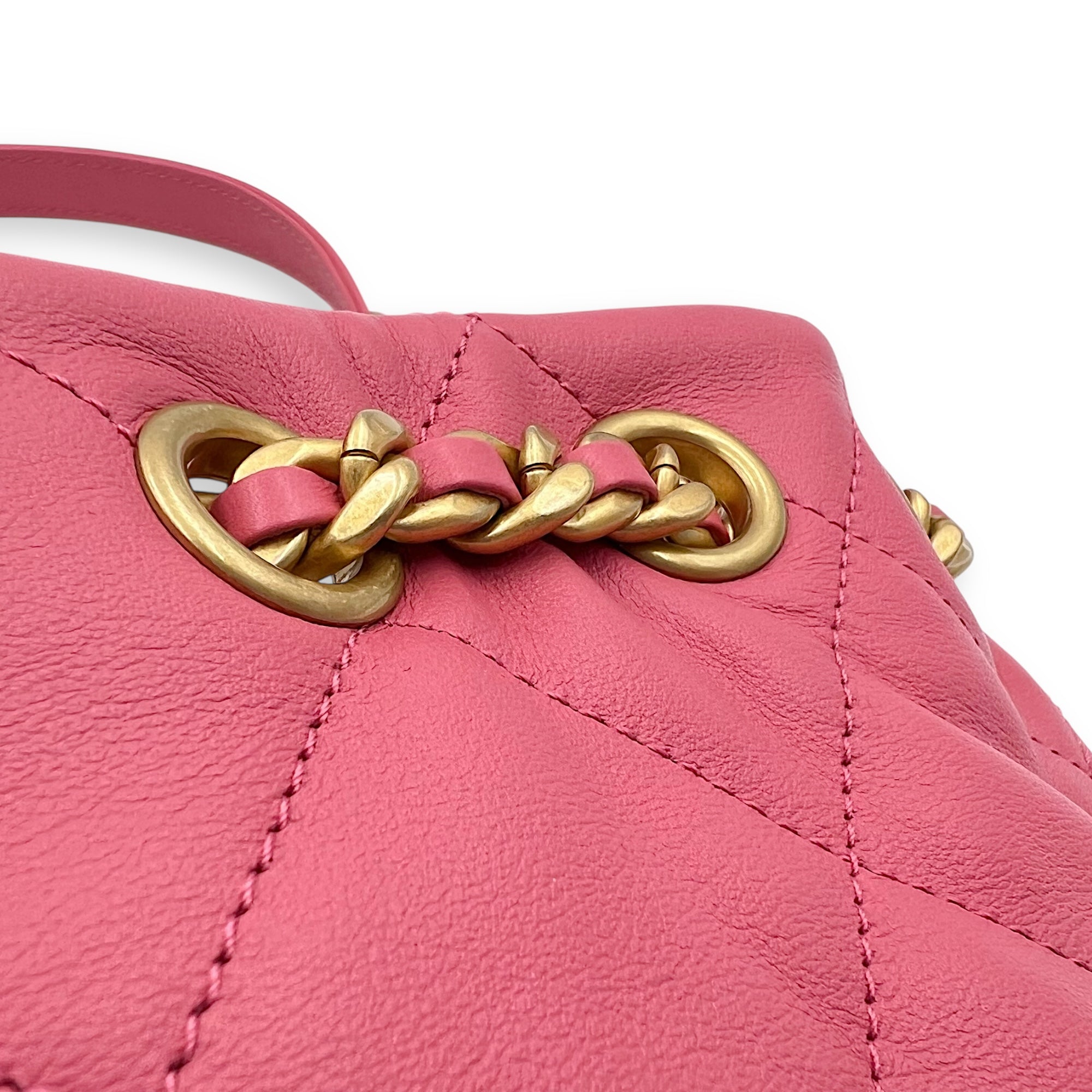 Be the first to review “Quilted Seasonal Bucket Bag Pink in Calfskin, Gold hardware”